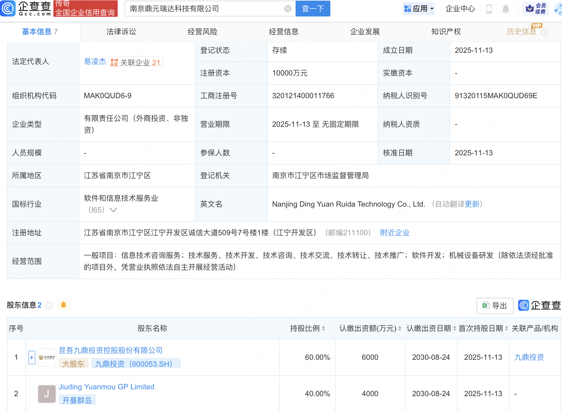 近日天盈资本,南京鼎元瑞达科技有限公司成立,注册资本1亿元,经营范围包含:信息技术咨询服务;软件开发;机械设备研发等。企查查股权穿透显示,该公司由九鼎投资(600053)等共同持股。