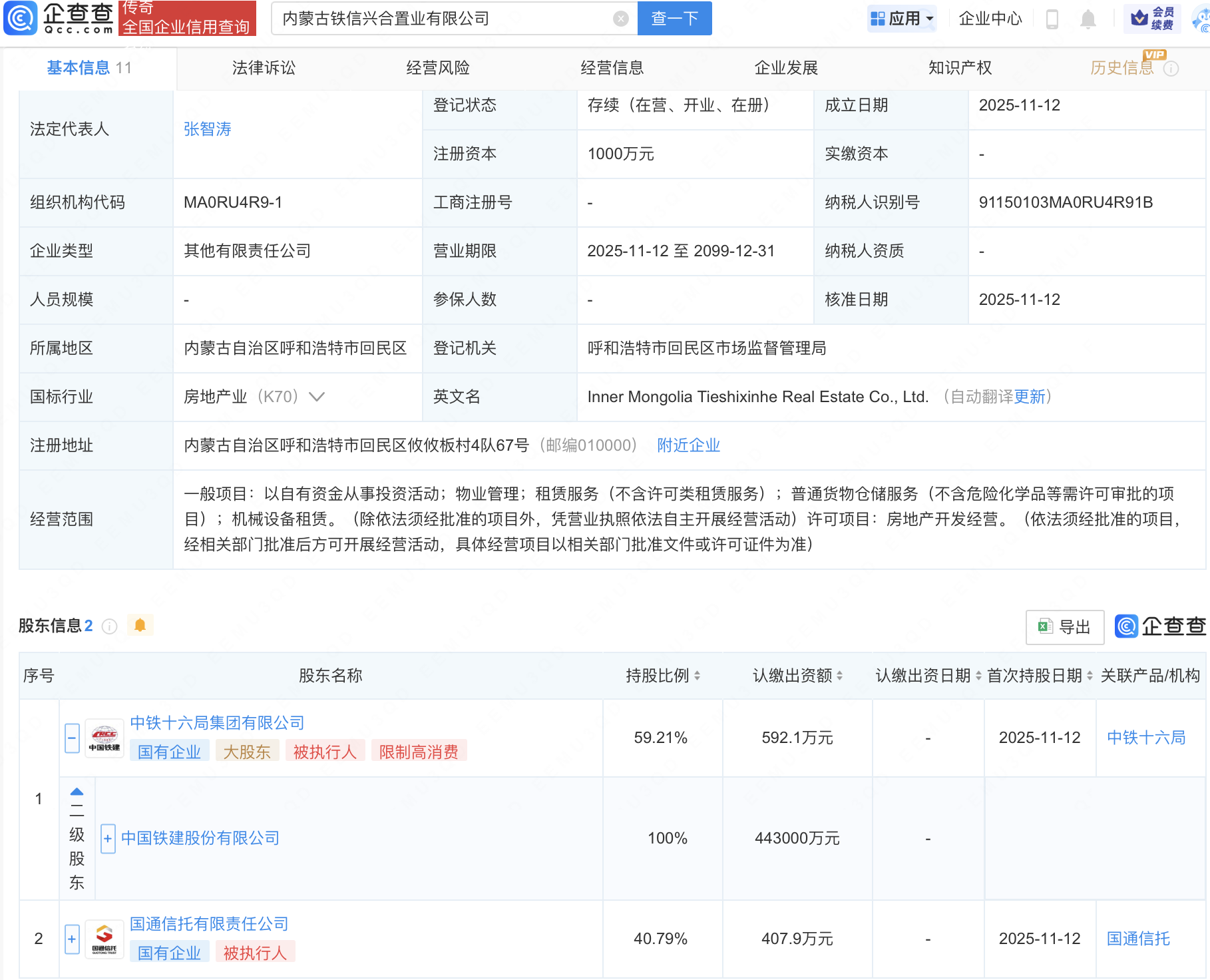 近日,内蒙古铁信兴合置业有限公司成立集采优配,注册资本1000万元,经营范围包含:以自有资金从事投资活动;物业管理;房地产开发经营等。企查查股权穿透显示,该公司由中国铁建(601186)全资子公司中铁十六局集团有限公司、国通信托有限责任公司共同持股。