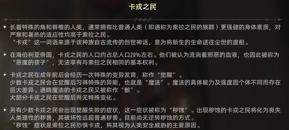 头顶有角的卡戎天生拥有比普通人更强的体魄,也拥有学习魔法的潜力,但卡戎之民在成年前会有一次特殊的变异发育,少数卡戎会在觉醒中获得强力的魔法异能,这样的卡戎被称作“骸”,其魔法的能力强度每个个体都有巨大差异,大部分卡戎变异后无特殊变化,另有一小部分卡戎会觉醒失败,化为失去理智的强大破坏性怪物。因此卡戎之民的“骸”是好战的帝国手中的必争兵器,又因为卡戎可能会变为怪物在帝国受到严厉管控,在民众发酵的恐惧和帝国有意控制的舆论下,卡戎之民被称为“恶魔的孩子”,在这个世界出生就是有罪的,地位卑微至极。