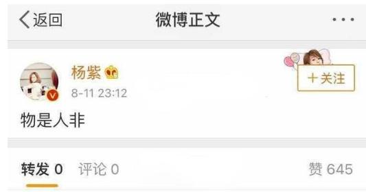 风波未平,2018 年 8 月,杨紫一条“物是人非”的微博秒删。