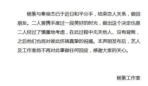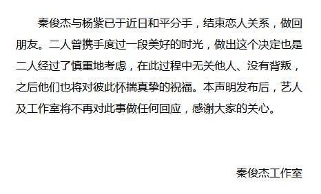 随后,秦俊杰与杨紫的工作室同步发布分手声明。