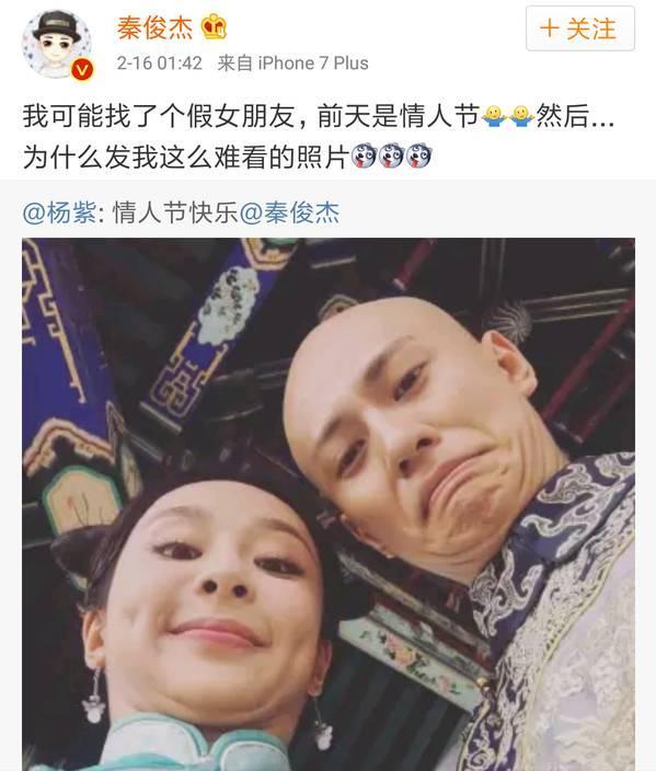 秦俊杰随即转发调侃“找了个假女朋友”。